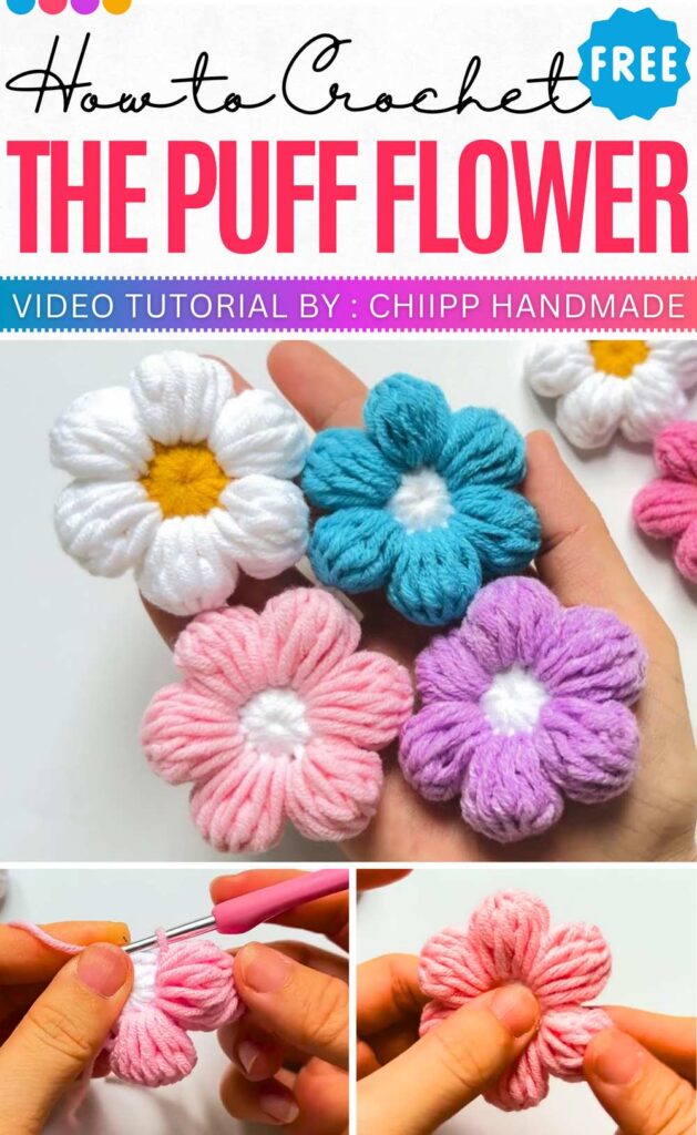 Quick and cute, this crochet 3D puffy flower is a must-have 6-petal flower. With this pattern, you can crochet a round, large, and plush puffy flower by working in the rounds and crocheting puff stitch. Choose from the daisy to the Sakura variation, or choose any often two colors that will make it look super cute.