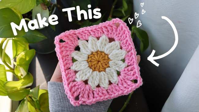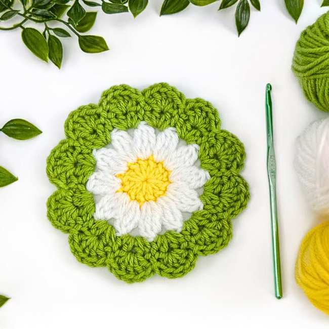 Learn how to crochet a 3D daisy into a functional 4.5″ x 4.5″ square.