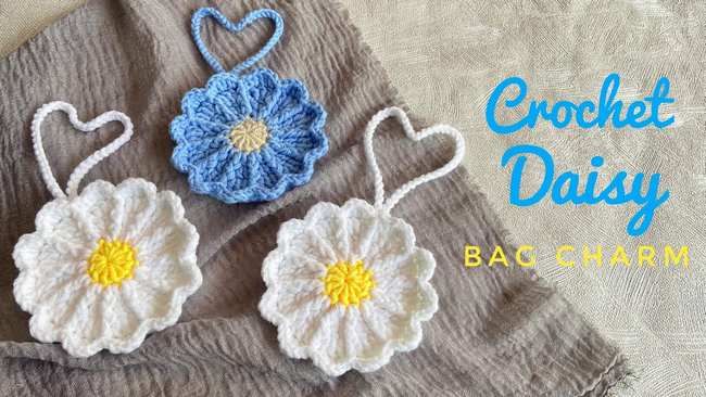 In less than 12 minutes, learn how to crochet a flat daisy bag charm with two leaves and a crochet string for attaching. There will be 12 petals per daisy, and also two eyes. The method of crocheting the daisy is easy and no-sew.