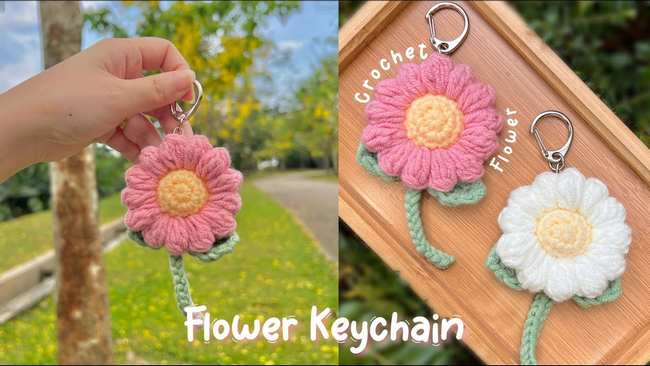 This 5-petal flat daisy flower keychain with a leaf is so easy and cute. You will try a unique color combo of dark green and pink. It can be attached to your bag handle, as you will also learn how to crochet the cord for hanging. If you have thin yarn, the tutor will show you tricks to work with two yarn strands at once to make it a little bigger.
