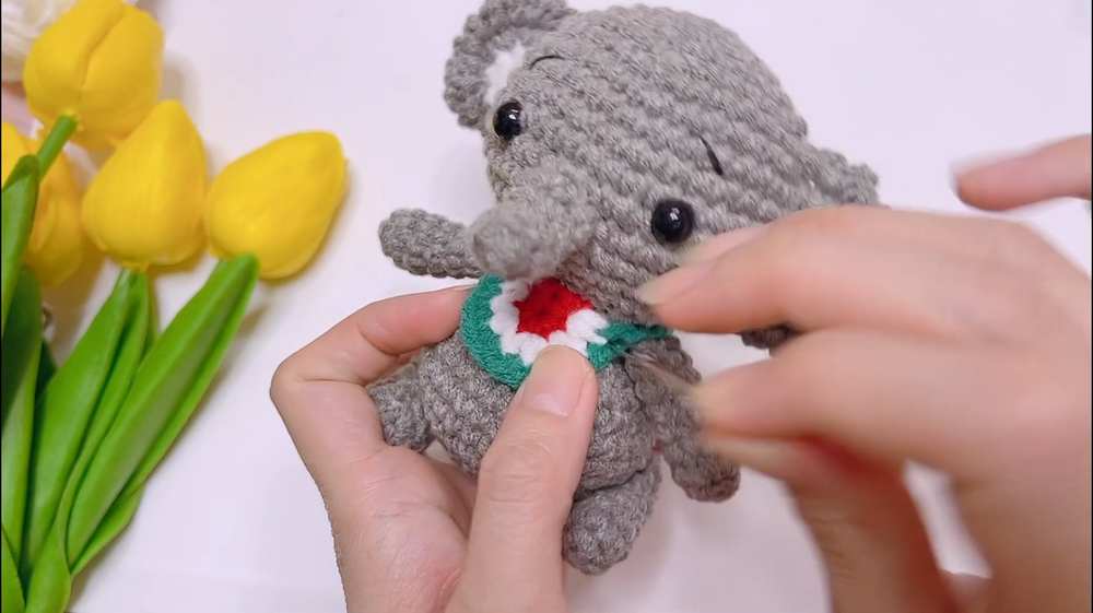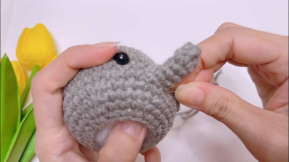 - Trunk Attachment: Position the trunk centrally between the eyes on the head. Ensure the curve faces downward. Sew the open end of the trunk to the head, spanning across R11 to R12.