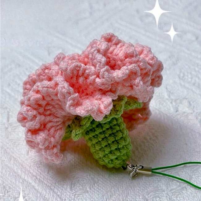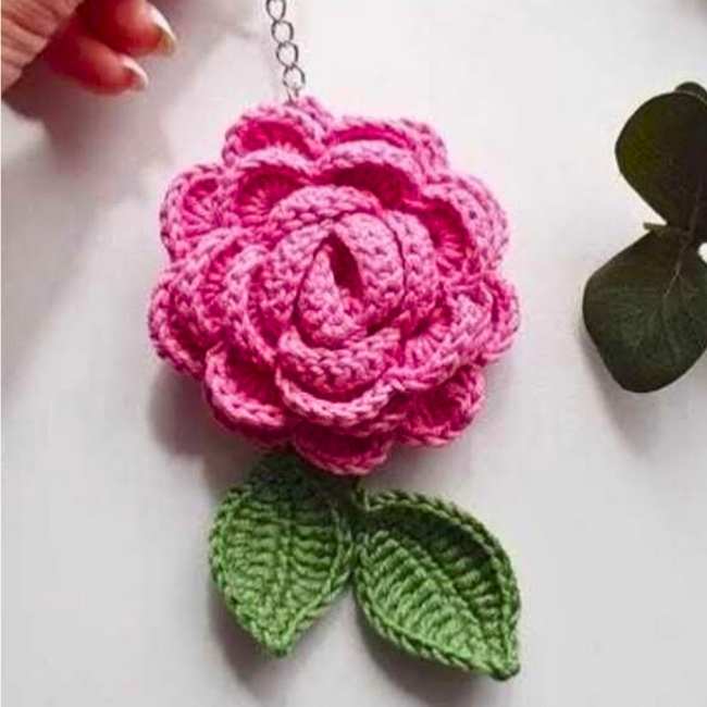 It is so easy and fun to crochet a keychain with a small crochet leaf in dark green. Crochet such a rose for holding a keychain in hand instead of in a bag charm. You can learn crocheting in less than 13 minutes.