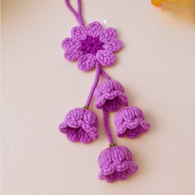 This crochet bag charm features a pair of bell or lily of the valley flowers and two crochet leaves. You will work the flower as a small tube by working in the rounds, and then work shell stitches for the edgings. You have to work the 10 six times to make these patals.