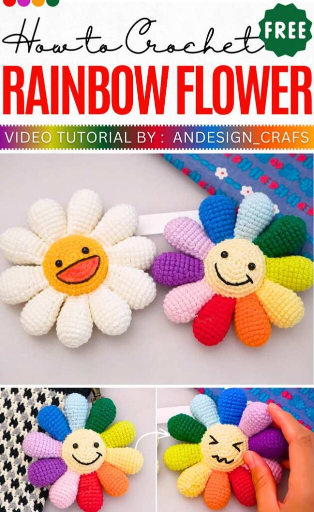 Learn how to crochet a smiling stuffed daisy flower in common daisy and rainbow daisy variations. You can also choose from an open mouth with blush color or a straight embroidery mouth. You must choose a different color for each petal in the rainbow variation.
