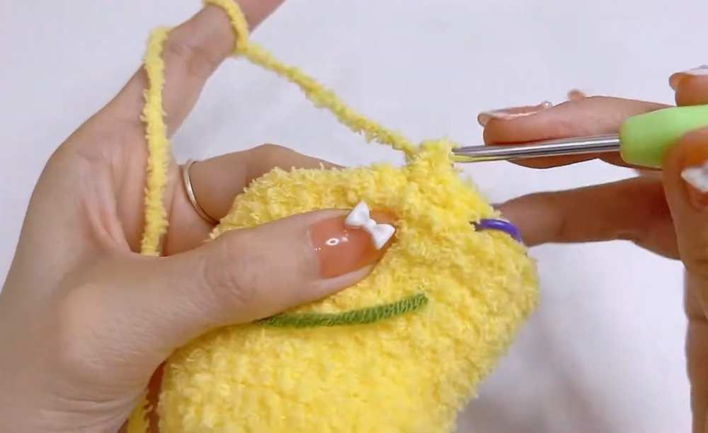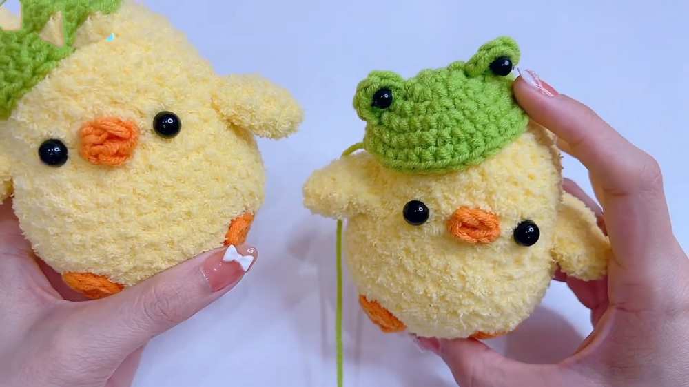 This pattern is for a Baby Chicken wearing a Frog Hat. The creator in the video uses fluffy/chenille yarn for the chick and cotton yarn for the hat details, but you can use any yarn of your choice.
