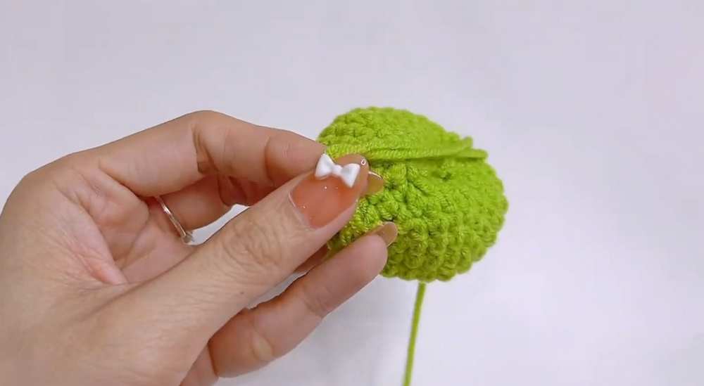 - Hat: Sew the white eye circles to the top of the green hat. Add black pupils (beads or embroidery). Place the hat on the chick’s head.