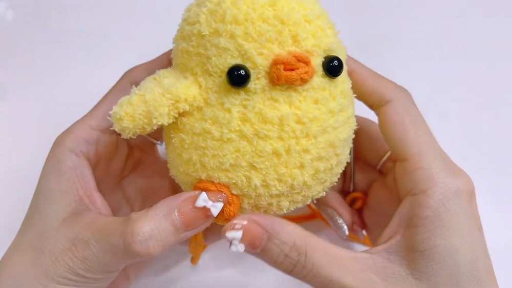- Yarn: Fluffy/textured yarn (Yellow for the chick, Green for the hat, Orange for the beak and feet)