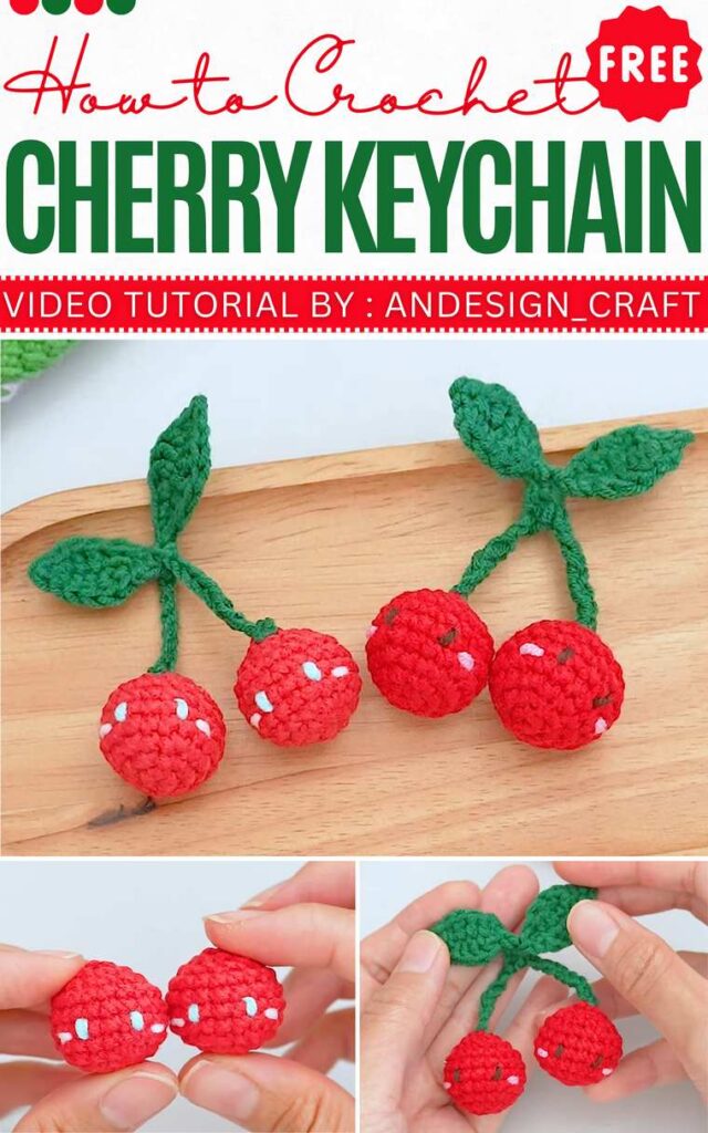 Crochet kawaii cherry bag charm also for spring, featuring a pair of miniature cherries. Using a 3mm hook and 4-ply cotton yarn, the cherries are identical, and there are two detailed green leaves and a connecting stem using chain stitch.