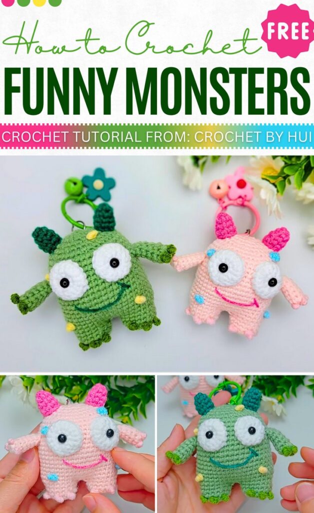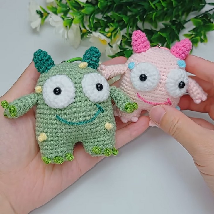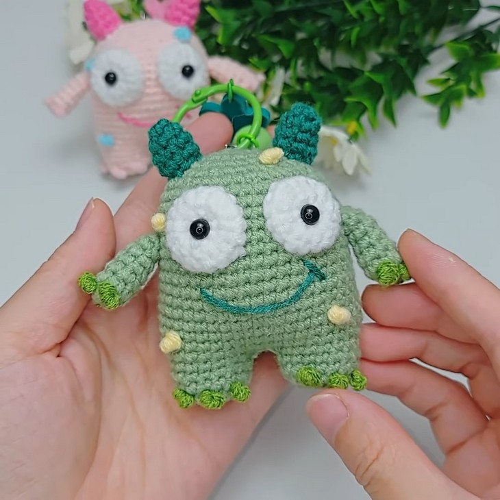 Skill Level: Intermediate. To crochet this cute monster amigurumi pendant, start with a Magic Ring for the main body, eyes and even arms. Use a Chain Stitch to start new rounds or create spacing as needed. The Short Stitch (Single Crochet) serves as the main stitch for the body and eyes. Use the Increase and Decrease Stitches to shape the body, limbs, and face by adding or reducing stitches. Finally, use Slip Stitches to join rounds seamlessly or finish certain sections.