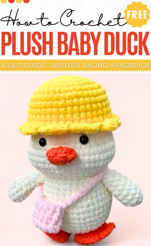 Learn how to crochet a 33 cm baby duck plushie with a bucket hat and a shoulder bag for summer. It will be a huggable plushie for picnics, thanks to the accessories. You can also crochet the bag as a small pouch. The hat is simple and looks so cute with the shell stitch edging.