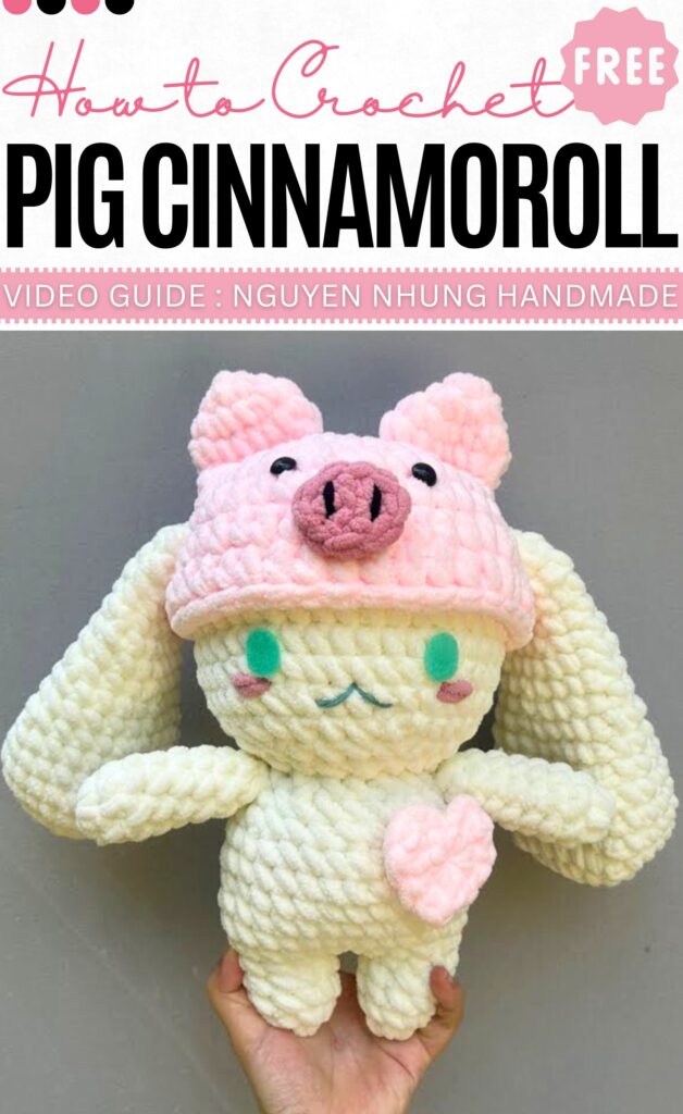 These are the cutest crochet big plushie video patterns for gifting to little ones. They will measure from 28 cm to 38 cm and will make huggable buddies and dolls. From the crochet Cinnamoroll plushie to the duck plushie, bunny to pig, this small list will get you covered. You can prepare them with the super bulky chenille yarn quite quickly with small accessories and a few parts needed.