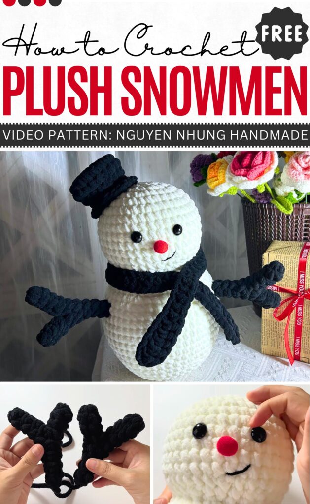 Winter is still there for a while, so crochet this 34 cm snowman plushie as a desk buddy and huggable doll. You have to use Jumbo velvet yarn with an 8mm crochet hook for all the parts of this snowman plushie. Usually, there would be a need for worsted or DK yarn for crocheting the sticks, but the tutorial will teach you how to crochet the plushie with the velvet yarn sticks.