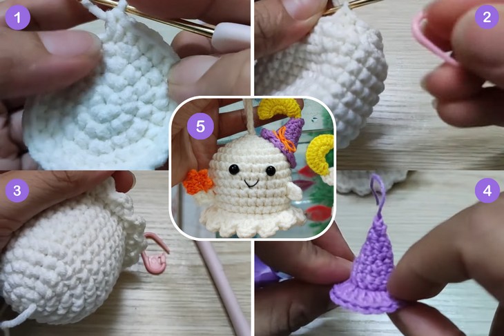 Skill Level: Beginner – Intermediate. The tutorial uses many basic amigurumi techniques and stitches to crochet the crochet ghost. Start with the magic ring for the body and hat. The main stitch used is the single crochet, as usual amigurumi. Increases and decreases are used extensively to shape the body and head, creating a seamless, rounded form.