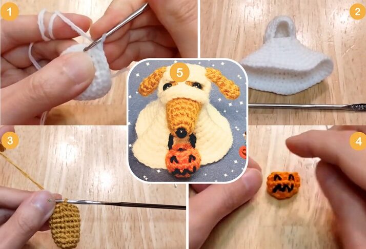 Tutorial Timing: 34 minutes only. (perfect for getting your hands on working with small parts, embroidering, and seamless sewing. The chain-skipping that is used in this puppy amigurumi is used in many other projects like no-sew bag handles, mesh stitch, and animal ghost pattern. You will also learn how to crochet a pumpkin basket, but in a mini size, whose pattern can also be extended.)