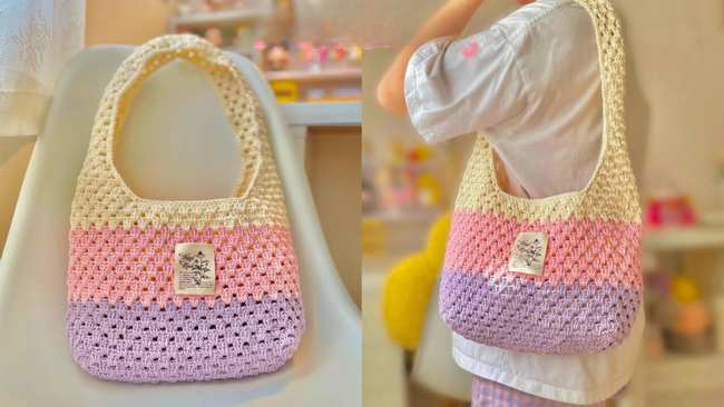 The hexagon handles are very comfortable to grab, and it will also feature a button to close it. The bunny appliquée looks cute and can be crocheted as a single piece with crocheted blush rounds.