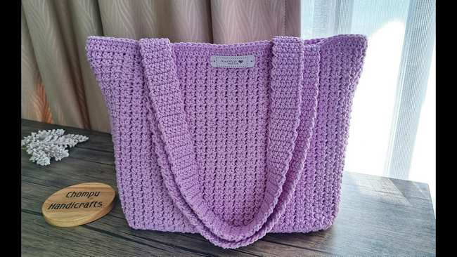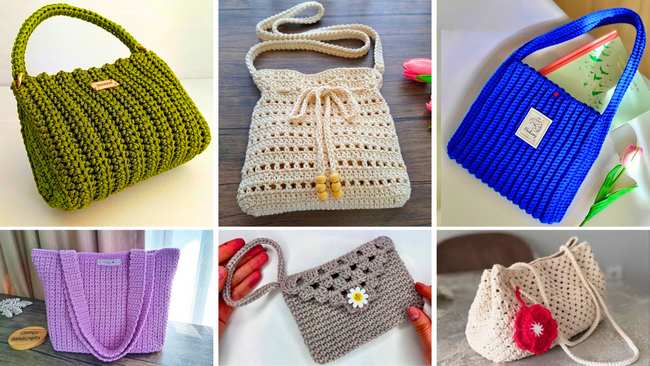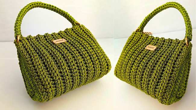 Follow this tutorial to crochet a 25 cm by 12 cm handbag using the T-shirt yarn and a metal ring handle. You have to use a 6.5mm crochet hook and start working around a metal clasp ring. You also need the BLO and FLO for crocheting the texture and work this crochet bag in back and forth rows.