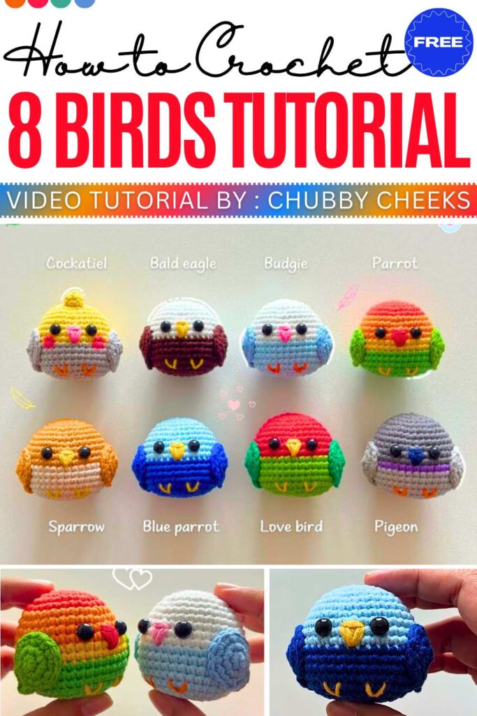 This tutorial crochet eight different birds using single pattern! It crochet the a cockatiel, bluebird, and sparrow—using one single, adjustable pattern. By simply changing your yarn colors and adding specific details like a head crest or specialized wings, you can create an entire flock of unique feathered friends.
