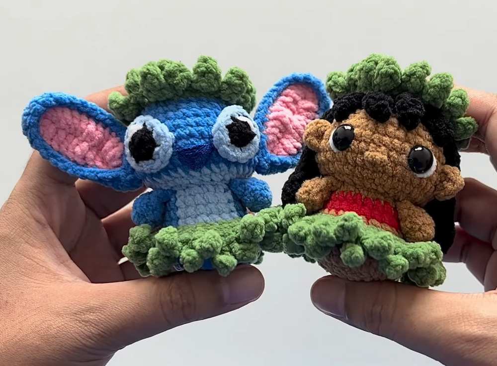 Crochet the head and body in rounds, starting with a magic ring and switching colors for the belly or dress. Use front-loop and back-loop stitches to create texture for the clothes. For Stitch, sew on two-tone ears, felt-style eyes, and a dark nose. For Lilo, add a layered black hairpiece, a leaf crown, and a fringed green hula skirt.
