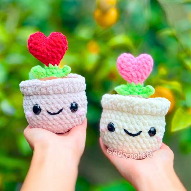 I am just in love with the crochet heart in pot amigurumi variation. The reason is the use of aqua with purple, pink with blue, and pastel purple with red. The popular one had the green and red colors. Also, there is a small crochet flower in yellow that complements the overall colors quite well.