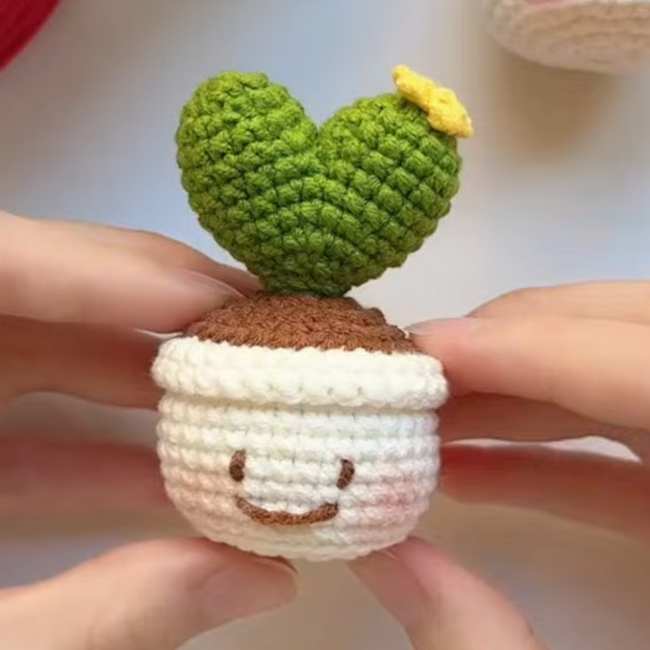 Learn how to crochet a green and brown smiling cactus plant in a pot with this tutorial. It has kawaii embroidery and finished with a small basic flower, too. It will measure small and made for gifting to a dear one.