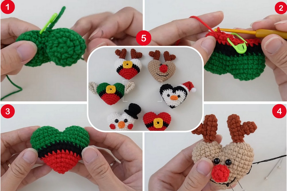 Also, this Christmas amigurumi set features the common additions like antlers, a belly belt, nose with fun accessories like a Santa hat and a snowman hat. In the tutorial, you will find clever guidance on crocheting all these heart charms within 30 minutes.