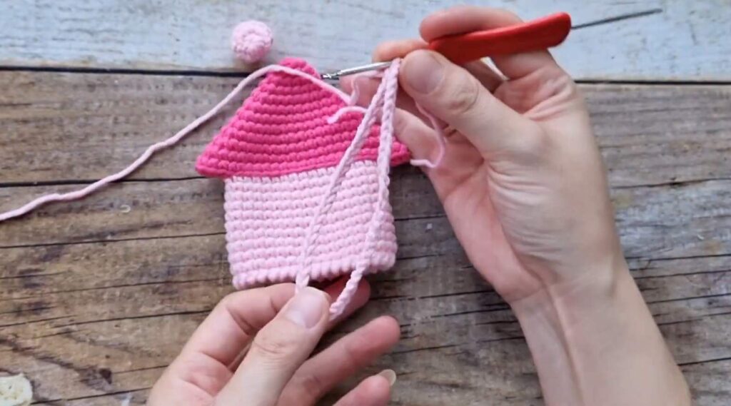 Shaping: Use a needle to pinch the corners of the roof (where increases were made) and sew through 4 sts to create a folded eaves effect on both sides.
