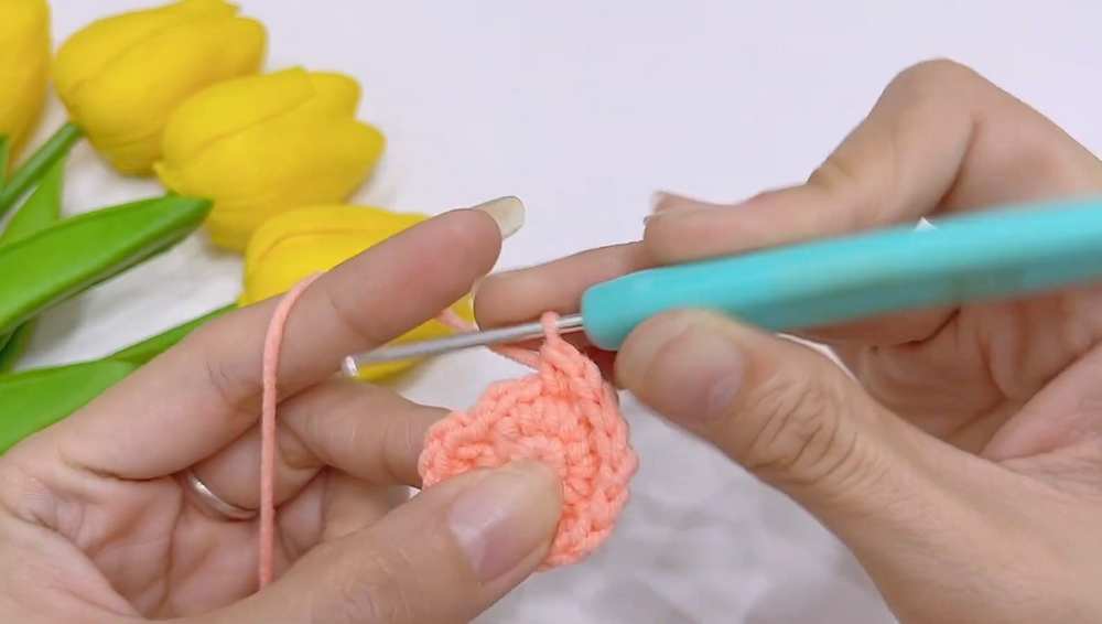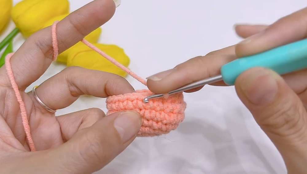 - R8 (Ruffle): (1 dc, 1 inc) repeat until the end of the round, sl stg.