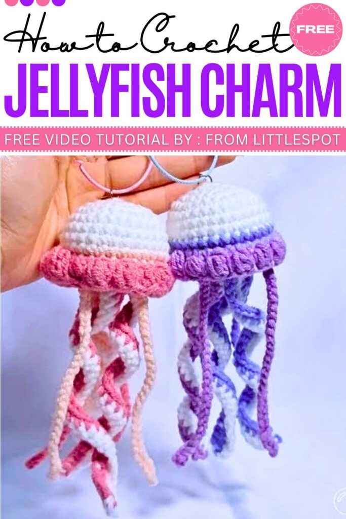 This quick tutorial shows you how to crochet a cute, no-sew mini jellyfish keychain in under 20 minutes. The project uses basic stitches and a clever loop technique to create the ruffled “skirt” and flowing tentacles without needing a needle for assembly.