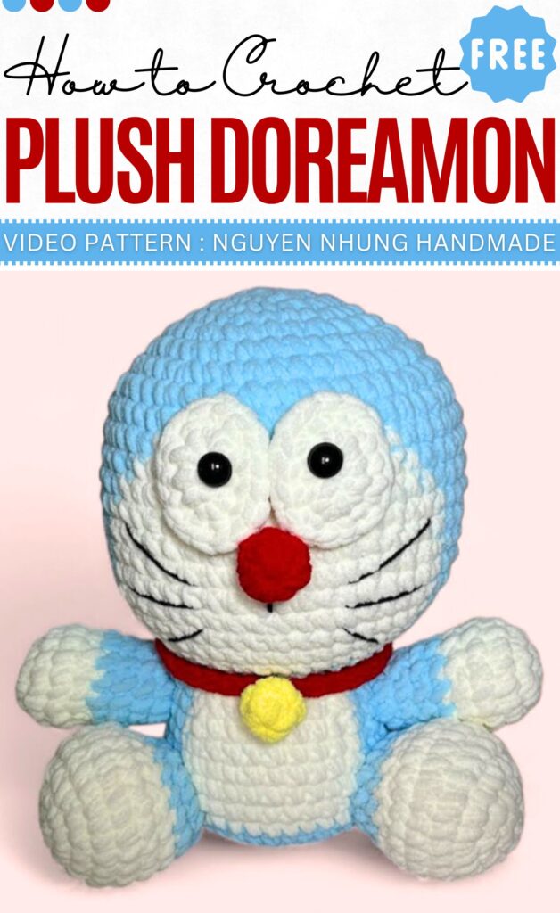 This chubby and sitting Doraemon plushie is so big and cute. There will be instructions for crocheting the head, body, eyes, arms, legs, and the bell and collar. The finished Doraemon will measure about 30cm when sitting.