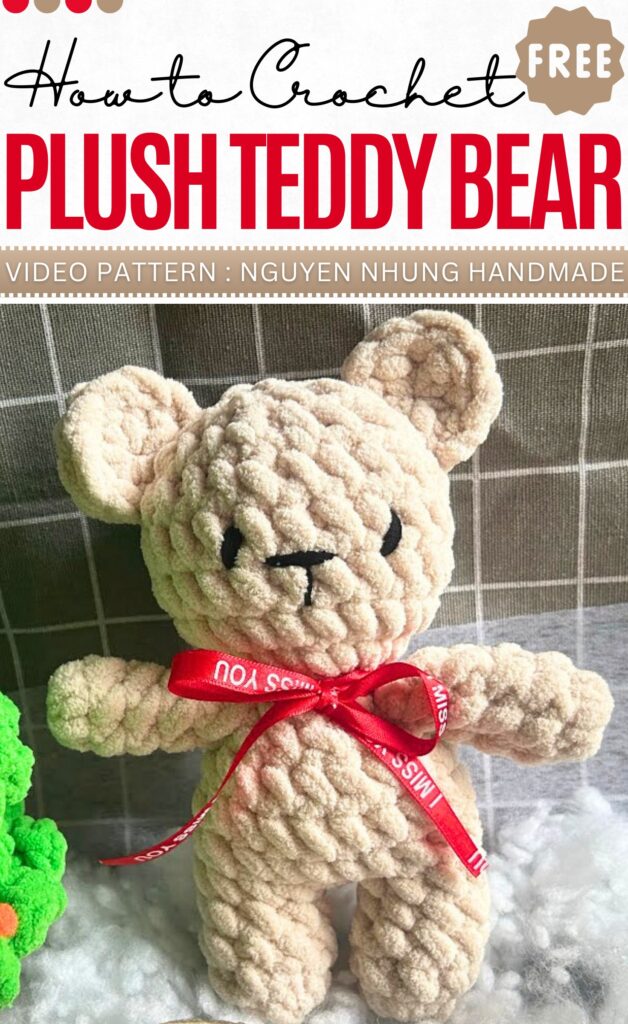 For Christmas or birthdays, this big teddy bear plushie will make a cherished present. Only needs one color, and the head, body, and legs will be worked as a single piece. The finished teddy bear for kids will be 20 high, using 6mm thick yarn and an 8mm crochet hook.