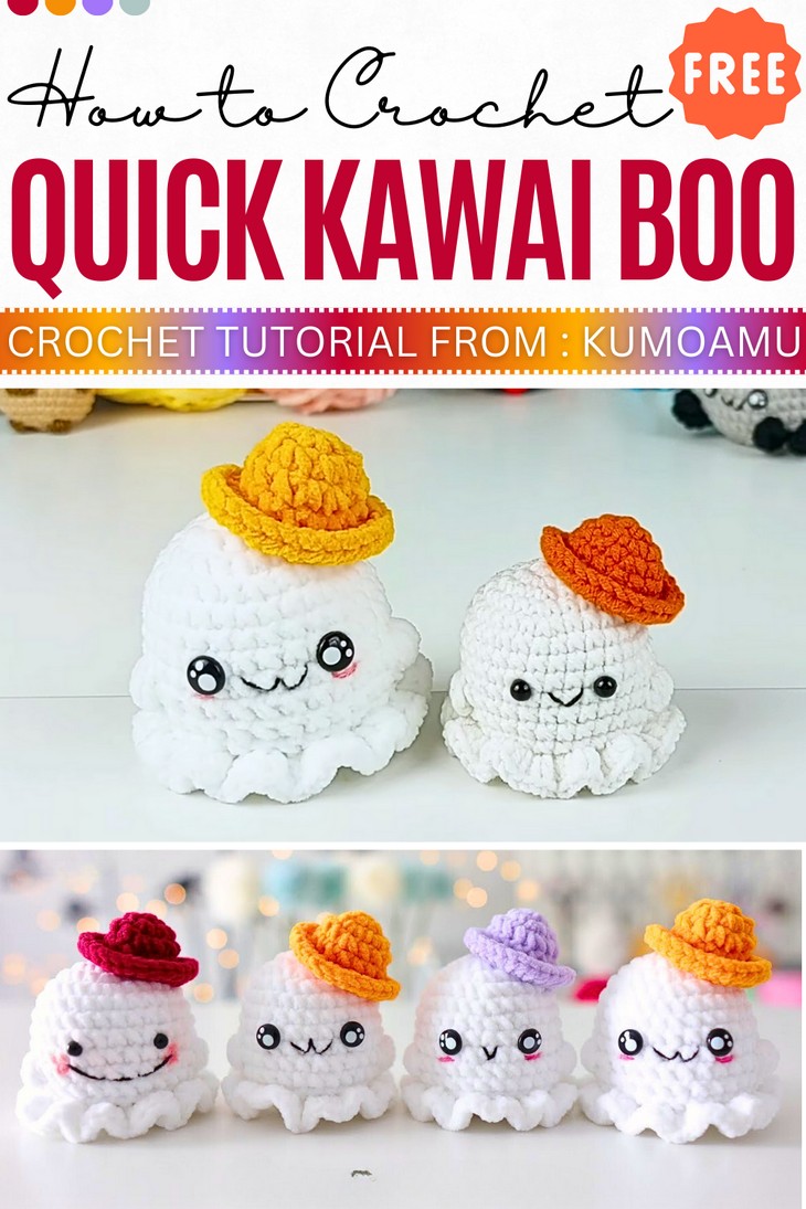 Who says a ghost amigurumi must be spooky? With a cute, quick, and last-minute design, you can bring smiles to many little faces. So, learn how to crochet these 20-minute mini kawaii boo ghost plushies with a stitch-by-stitch tutorial by Hanna. Each amigurumi boo has kawaii safety eyes, a ruffle skirt, and wears a tiny bucket hat with the option to choose from three embroidery mouths and hat colors from red to purple and orange. Crochet this set of cute Halloween ghosts for selling at craft fairs with use suggestions and a message. If for yourself, you can use them as a support squishy, bag charm, or Halloween ornament.