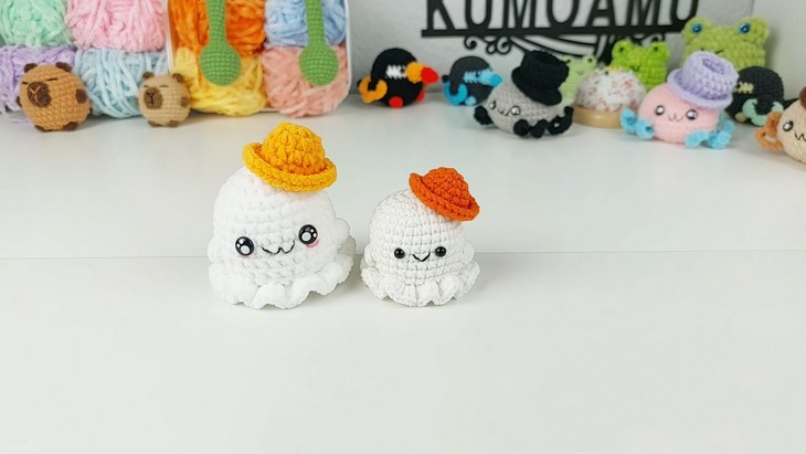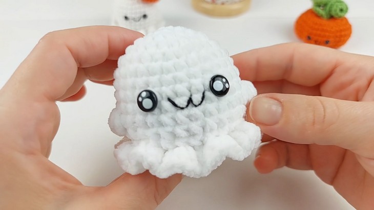 Personalization tips: You can choose from wide smile, V, and W mouth embroideries for each of your ghost plushies. The tutor also presents a sport yarn ghost version, which still looks awesome, and you can also try it. There is a presentation for the eyes, too. If you are a casual crocheter, you may not have the kawaii eyes, so the tutor showed a version with safety beads also. Whatever the yarn you choose, make sure you are comfortable with it and understand its tension variation.