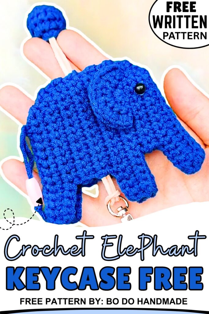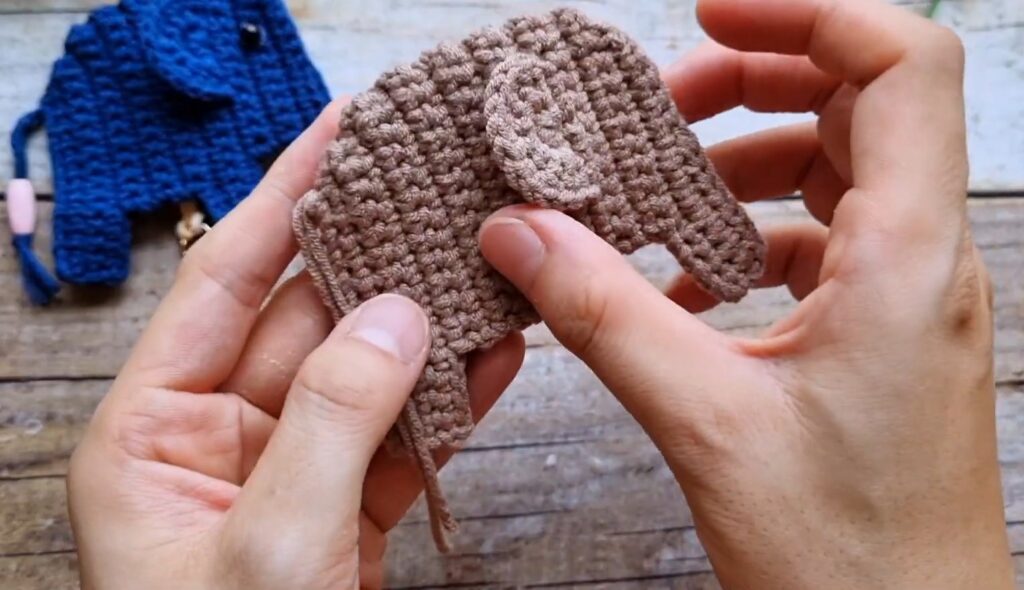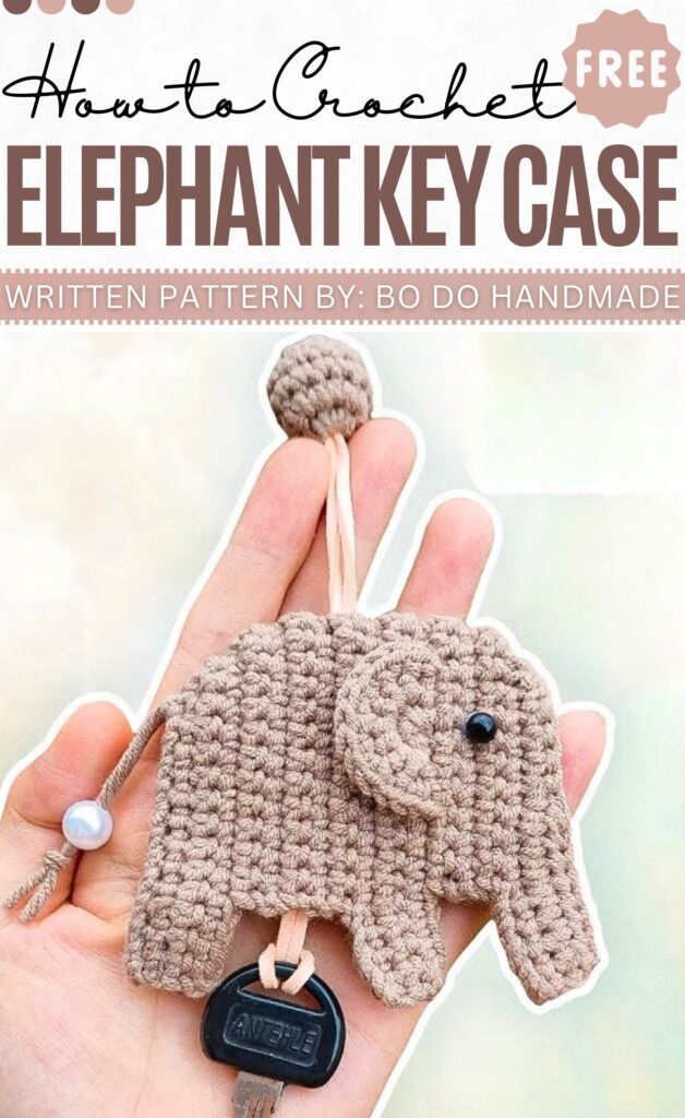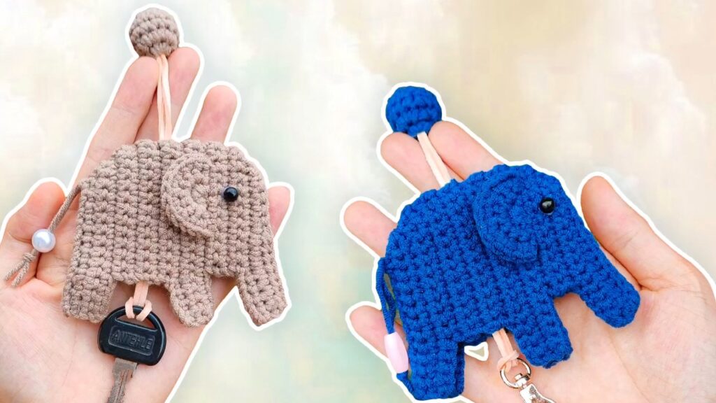 To make it, you crochet two flat elephant shapes and sew them together, leaving the bottom open. You then make two small ears and a little round cap. Finally, you pull a string through the top, attach your keys, and add eyes to finish.