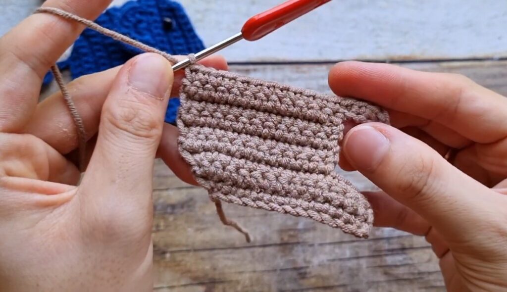 Row 17: Ch 1, turn. Skip first st, sc in next 5 sts, hdc in next 7 sts, sc in last st. (13 sts)