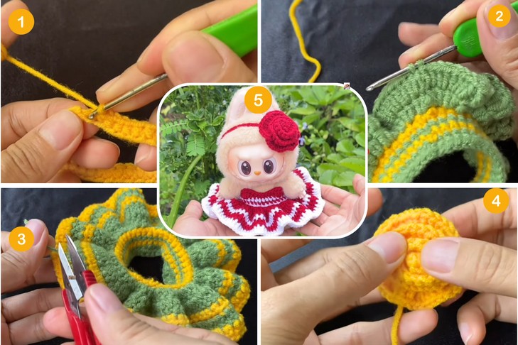 Skill Level: Beginner – Intermediate. The Labubu frock pattern is first worked from the bottom up to the top and then from top to bottom to crochet the skirt extensively using color changes. Beginning flat using foundation chains, you will join the ends to make a base circle whose length must be enough for Labubu. For the fourth round, instead of single crochet, you will be using a combination of sc, hdc, and slip stitch to make the rounded edges for the top!