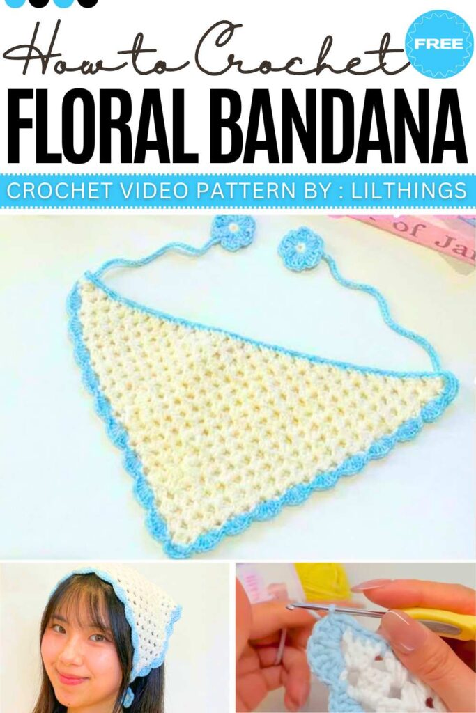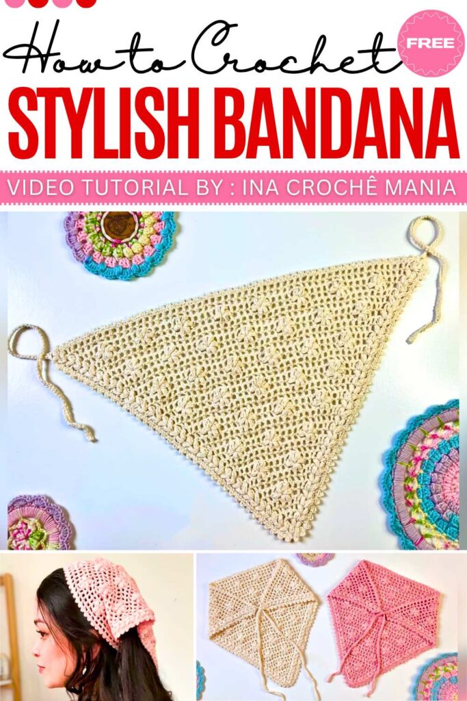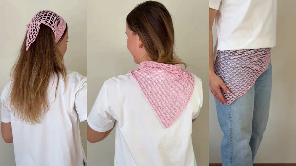 Here is the simplest bandana of this curation. This beginner-friendly Crochet Hip Scarf and Lace Bandana is a versatile mesh triangle shawl that can be worn as a head covering, a waist belt, or a lightweight scarf. It uses a simple repeating loop pattern that grows quickly, making it an ideal project for those new to crochet.