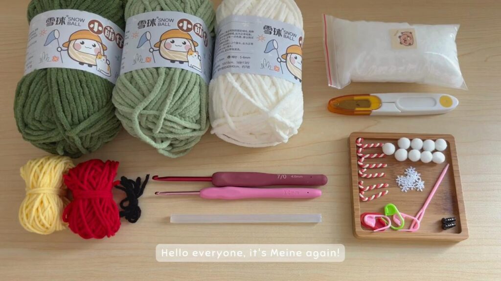 The tutorial for the crocheted Hello Kitty Christmas Tree uses the following materials: