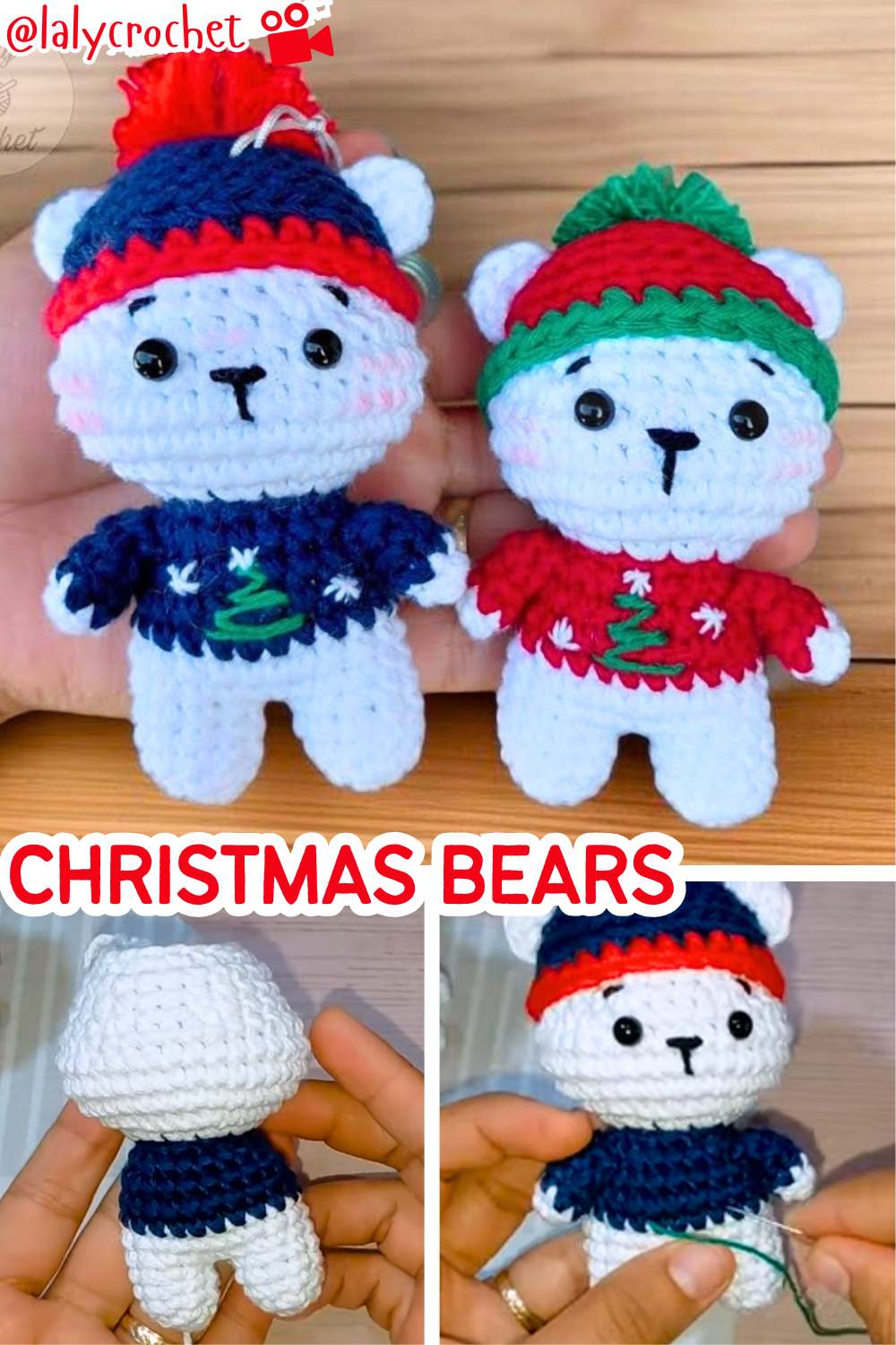 Crochet a pair of these last-minute Christmas bear amigurumi with a no-sew Christmas tree sweater and beanie. The pair differs in size (the second one is small) and colors of the sweater (red, blue & red, and green).
