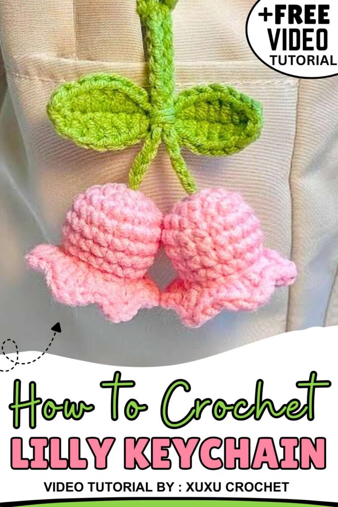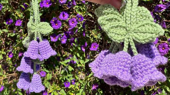 This crochet Lily of the Valley keychain features a pattern similar to the previous keychain, but you can now crochet it in purple. So, you can think of it as an inspiration for making a hanging of multiple Lily of the Valley keychains.
