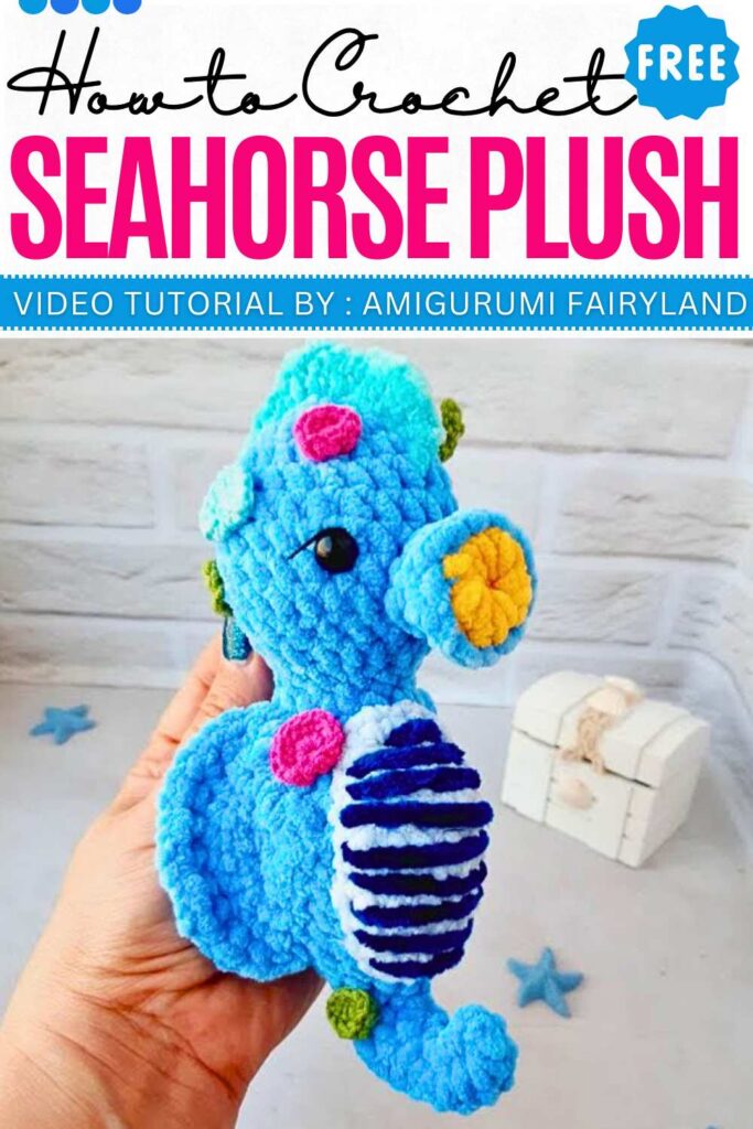 Follow these two parts of the tutorial to crochet a 20 cm plush seahorse using green, turquoise, aqua, dark blue, and pink. There are tiny appliques crocheted using the standard cotton yarn, and lovely belly colorwork using the dark blue yarn.
