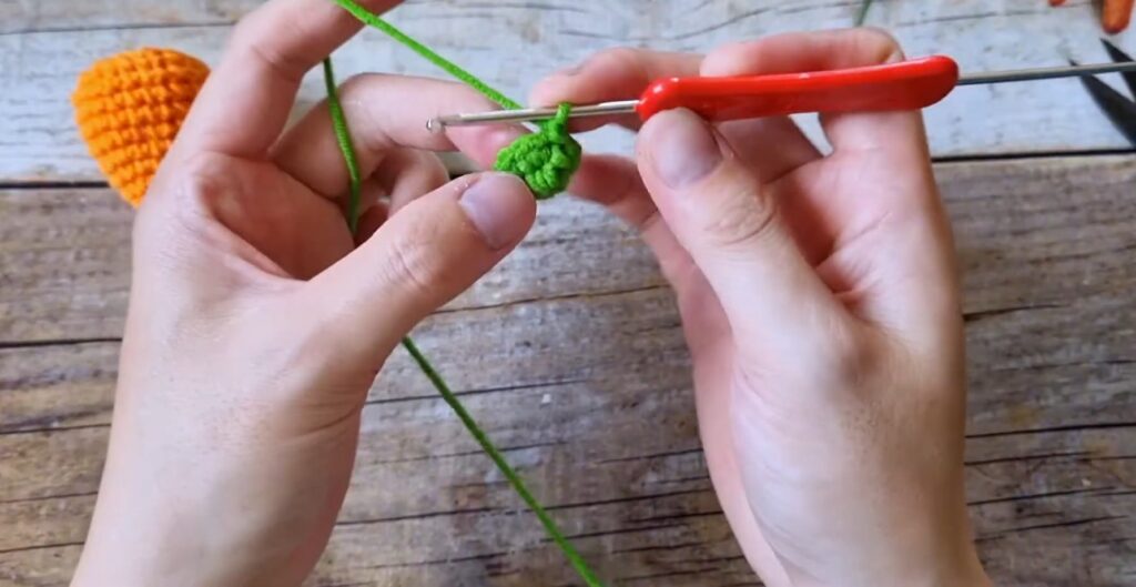 Add the leaves: Crochet three green pieces and sew them to the top.