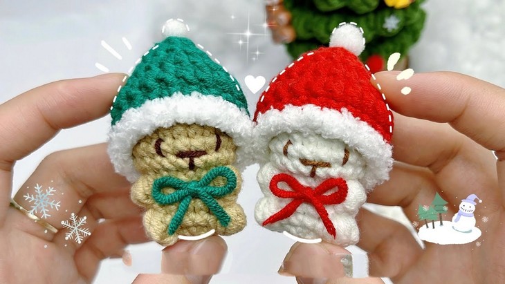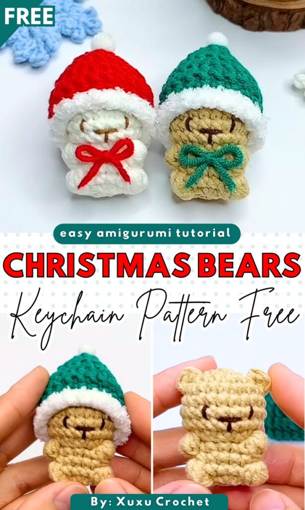 Want a 25-minute Christmas amigurumi for selling at craft fairs or last-minute gifting? With a tutorial from Xuxu, learn how to crochet these two no-sew and miniature Christmas bear keychains, including a polar bear and grizzly bear, each wearing a beautiful Christmas beanie and a bow tie, making them gift-ready. The pattern is kept basic, focusing on the sitting bear amigurumi with fuzzy pom-pom and hat bottom. To surprise you, the crochet beanies are removable and can be adjusted for large amigurumi, too. So, whether you use one as a Christmas ornament, bag charm, or pocket pet, they are worth crocheting.