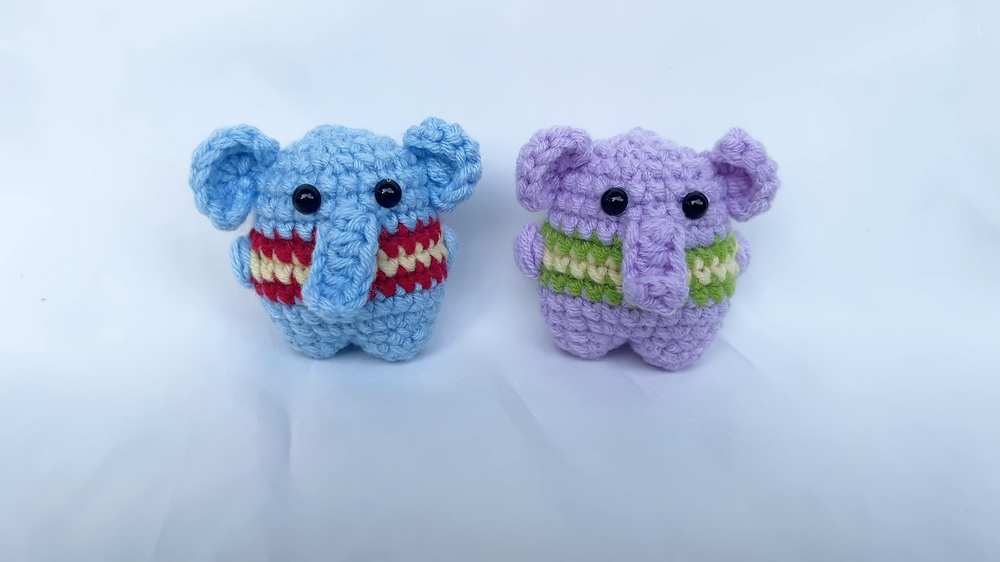 Crochet two small legs and join them to start the body. Switch between green, yellow, and purple yarn to create stripes on the torso. Use a popcorn stitch in round 7 to form the arms. Crochet a simple trunk and two rounded ears, then sew them to the head. Finish by adding safety eyes, stuffing with cotton, and closing the top.