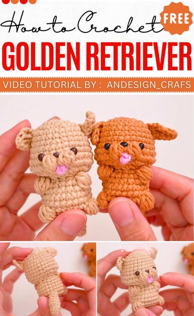 This is another crochet amigurumi Golden Retriever using 4-ply cotton yarn and a 3mm crochet hook. This needs the “no-sew” technique, which means the ears, legs, and tail are crocheted directly into the body. This time, you will crochet small standing puppy dolls that can be used as keychains.