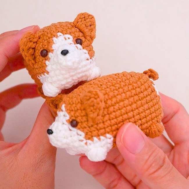 Follow this tutorial to crochet a funny and no-sew corgi dog amigurumi in an animal pose. That means it is standing on four legs. The back of the amigurumi has a white part made using color changes that looks very funny.