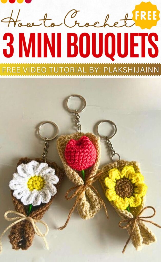 After you have done crocheting this, your favorite flowers with craft wire stems, you can wrap it in a Korean style. For a rustic look, the tutor has used jute cord. Crochet one as a keychain.