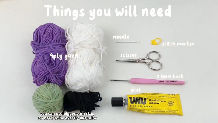 - 4-ply yarn in purple, white, green, and black (Note: The caption says you can use a bigger yarn size; it doesn’t have to be exactly the same.)