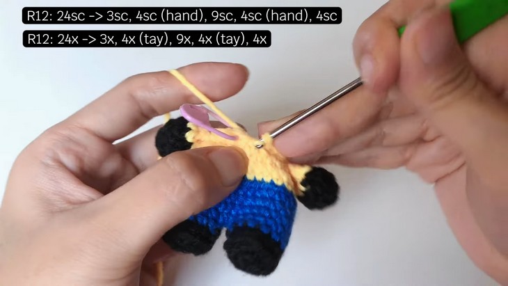 Skill Level: Beginner – Intermediate. This tutorial uses a variety of common crochet techniques and stitches. The magic ring is used to start the pieces, like the arms, legs, and head. The main stitch is the single crochet, which is used to create the body parts. The tutorial also uses increase and decrease stitches to shape the amigurumi, as well as the slip stitch to join rounds. The chain stitch is used to begin new rows and create the overall strap. A specific technique of working in back loops only is also used to create a defined ridge for shaping.
