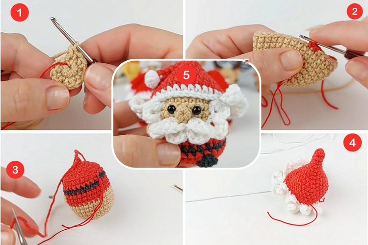 Working back-and-forth, learn how to crochet the beard using a combination of slip stitch and half-double crochet clusters in one stitch. The edging of the Santa hat also uses crochet, the FLO stitches, and the bobble stitch. Overall, you will need minimal sewing for the smaller parts.