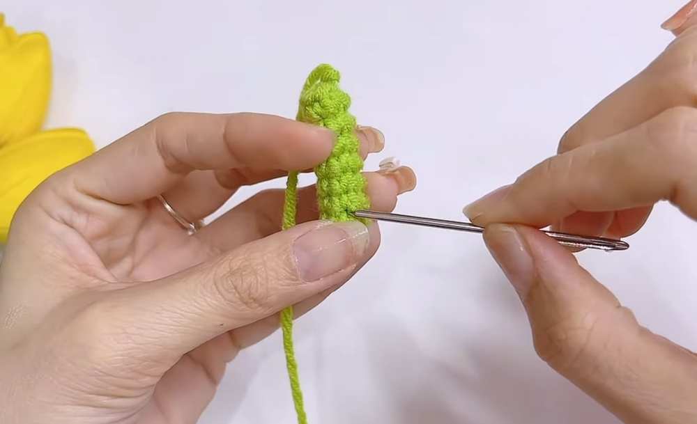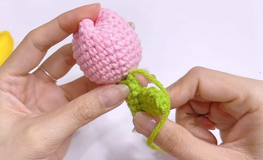 - Leaf to Stem: Sew the leaf onto the side of the stem, positioned approximately at R3 or R4 of the stem. Secure tightly and hide the yarn tail inside.